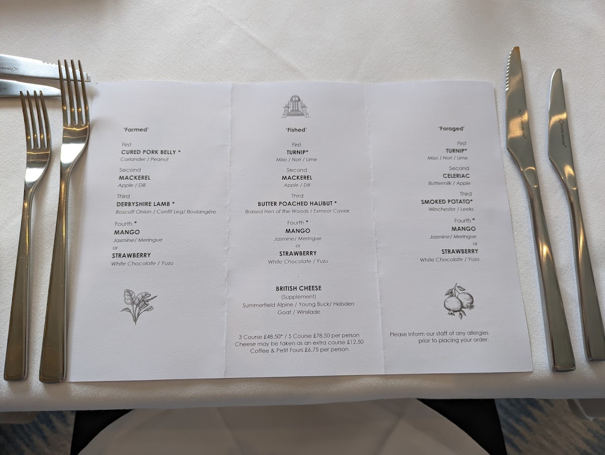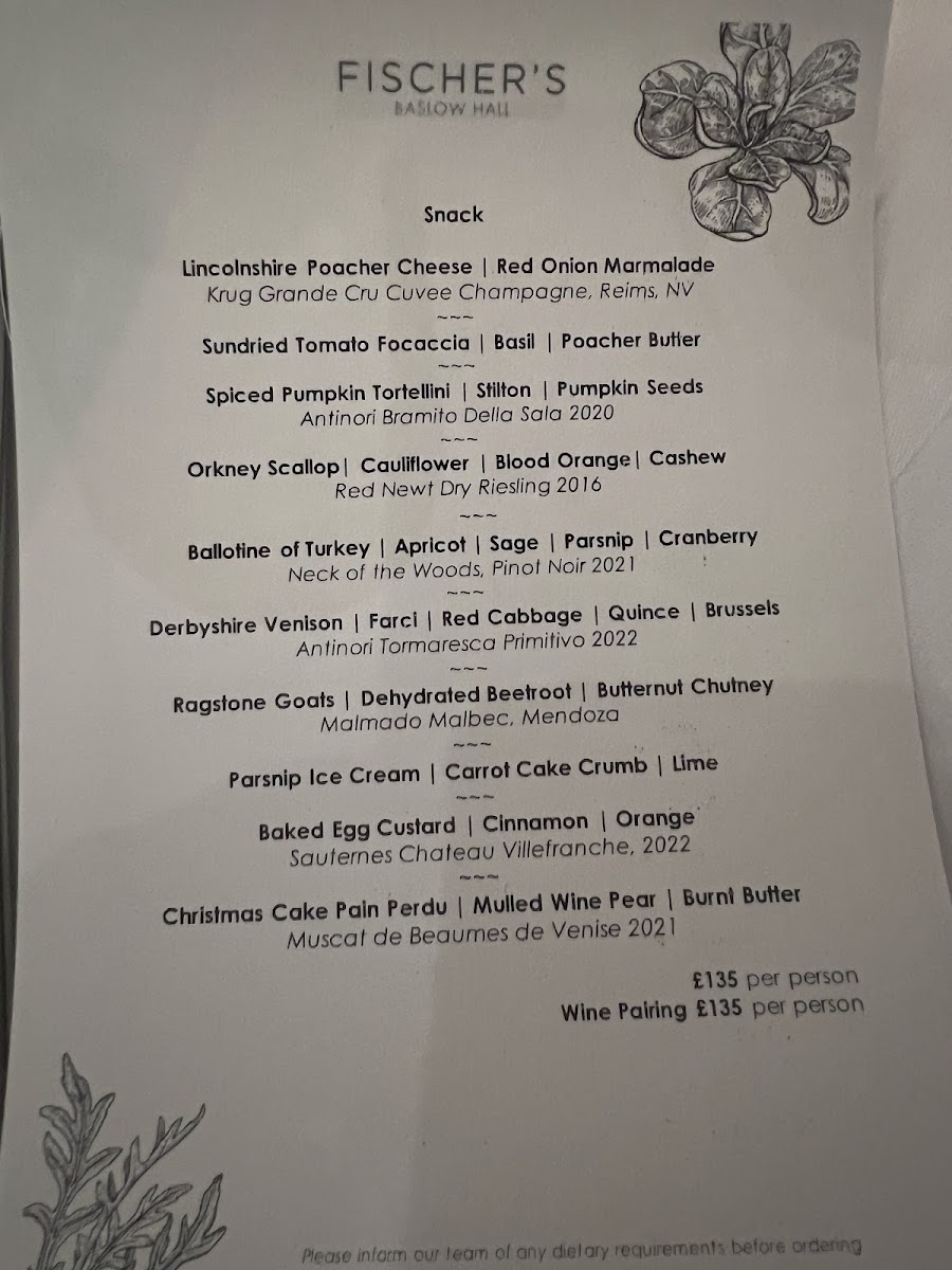 The tasting menu is a must-try for those wanting to explore a variety of flavors in one sitting. Each course is designed to surprise and delight, offering both richness and balance in every bite. In addition to their stellar food offerings, Fischer’s Baslow Hall also boasts an exceptional wine list, featuring a carefully curated selection of wines that complement the menu.